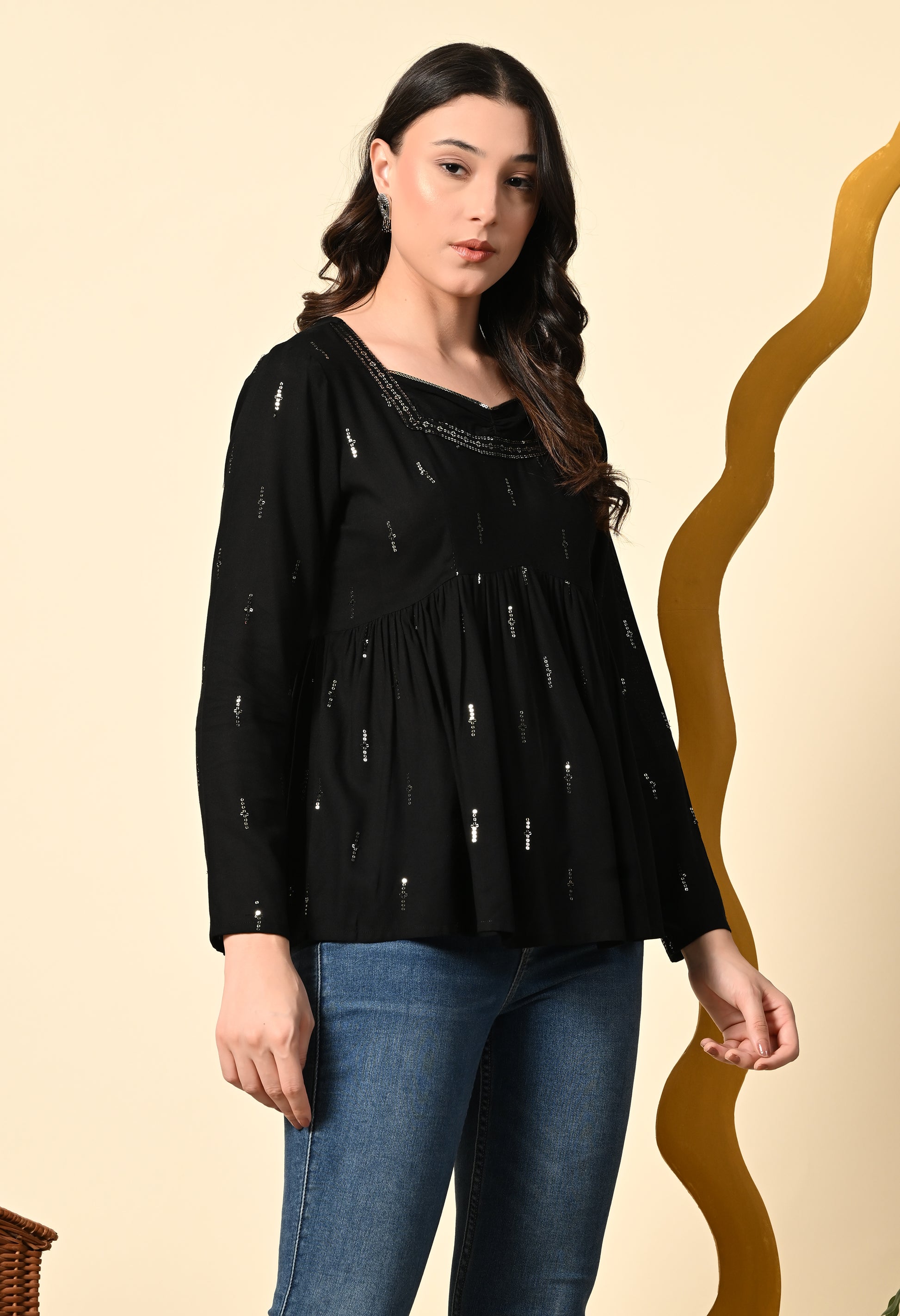 Elevate your style with this elegant black georgette peplum top featuring a flattering square neckline and delicate sequin embellishments. The flowy silhouette with subtle pleats around the waist adds a feminine charm, making it perfect for evening outings, festive gatherings, or dinner dates. Pair it with jeans or tailored trousers for a chic and graceful look.