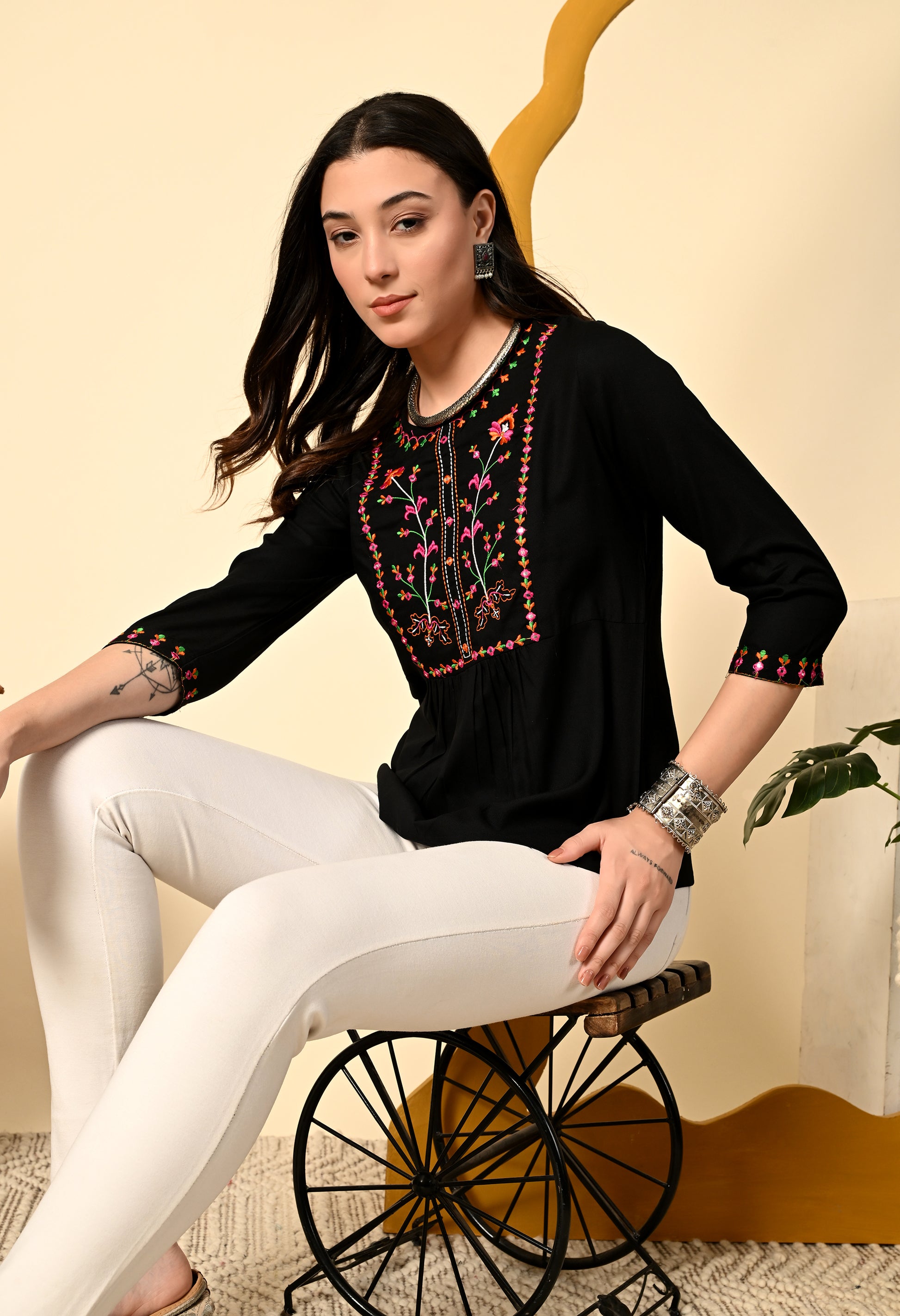 tep into effortless elegance with this rich black peplum top, crafted from soft rayon for everyday comfort. The intricately embroidered yoke in vibrant threadwork adds a beautiful ethnic charm, while the gathered flare below the bust offers a flattering fit for all body types. The neckline features a playful tassel tie-up, and the 3/4th sleeves come with matching tassel detailing for added flair. Pair it with jeans, palazzos, or skirts for a perfect Indo-western fusion look.