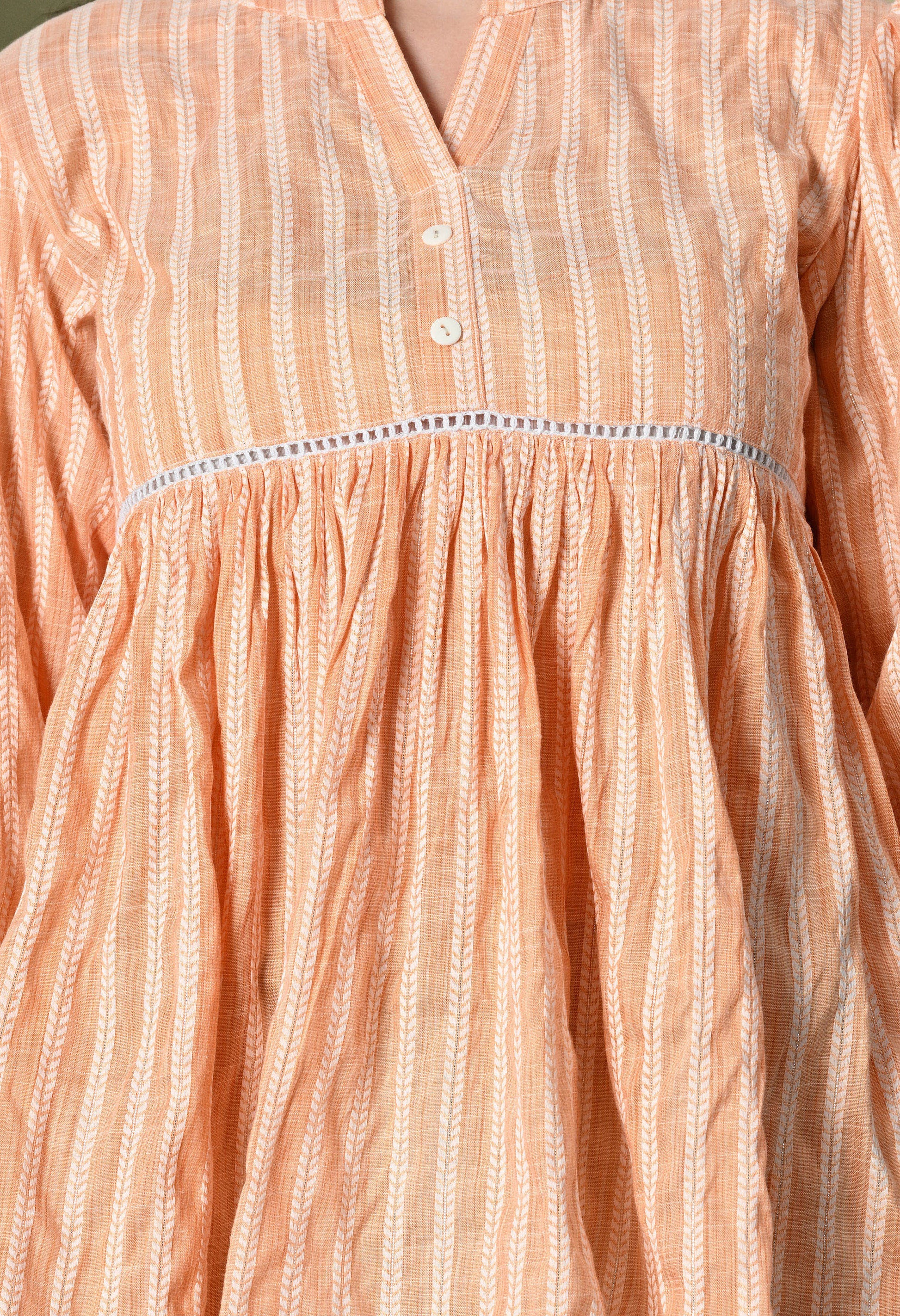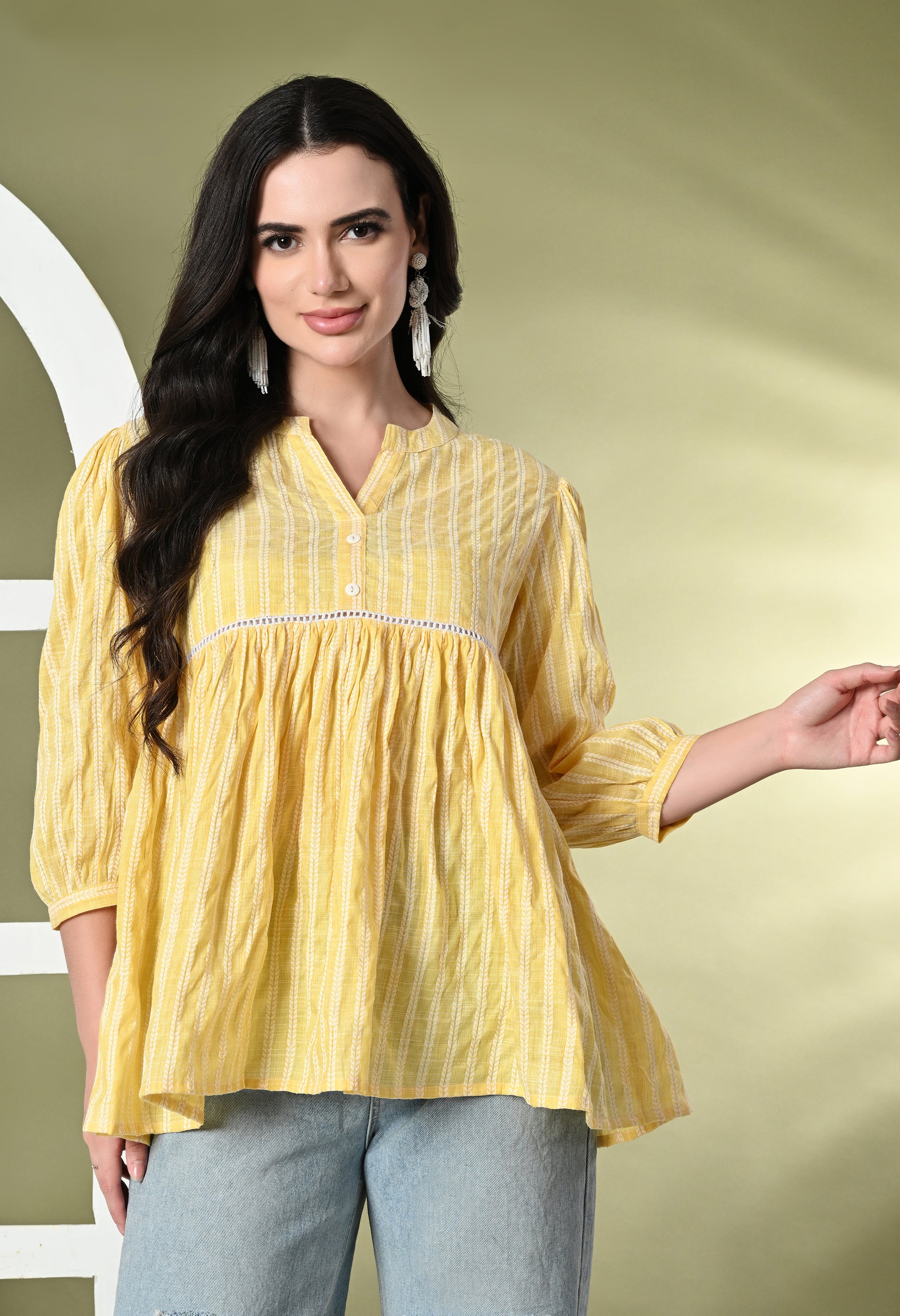 Add a refreshing charm to your everyday wardrobe with this lime green striped cotton top. Featuring a relaxed A-line silhouette, gathered flare below the bust, and front button placket, this top is designed for casual comfort with a touch of style. The 3/4th sleeves and soft cotton fabric make it breathable and ideal for summer wear. Subtle lace detailing at the waist adds a delicate touch. Perfect to pair with jeans, shorts, or palazzos for a relaxed yet stylish look.