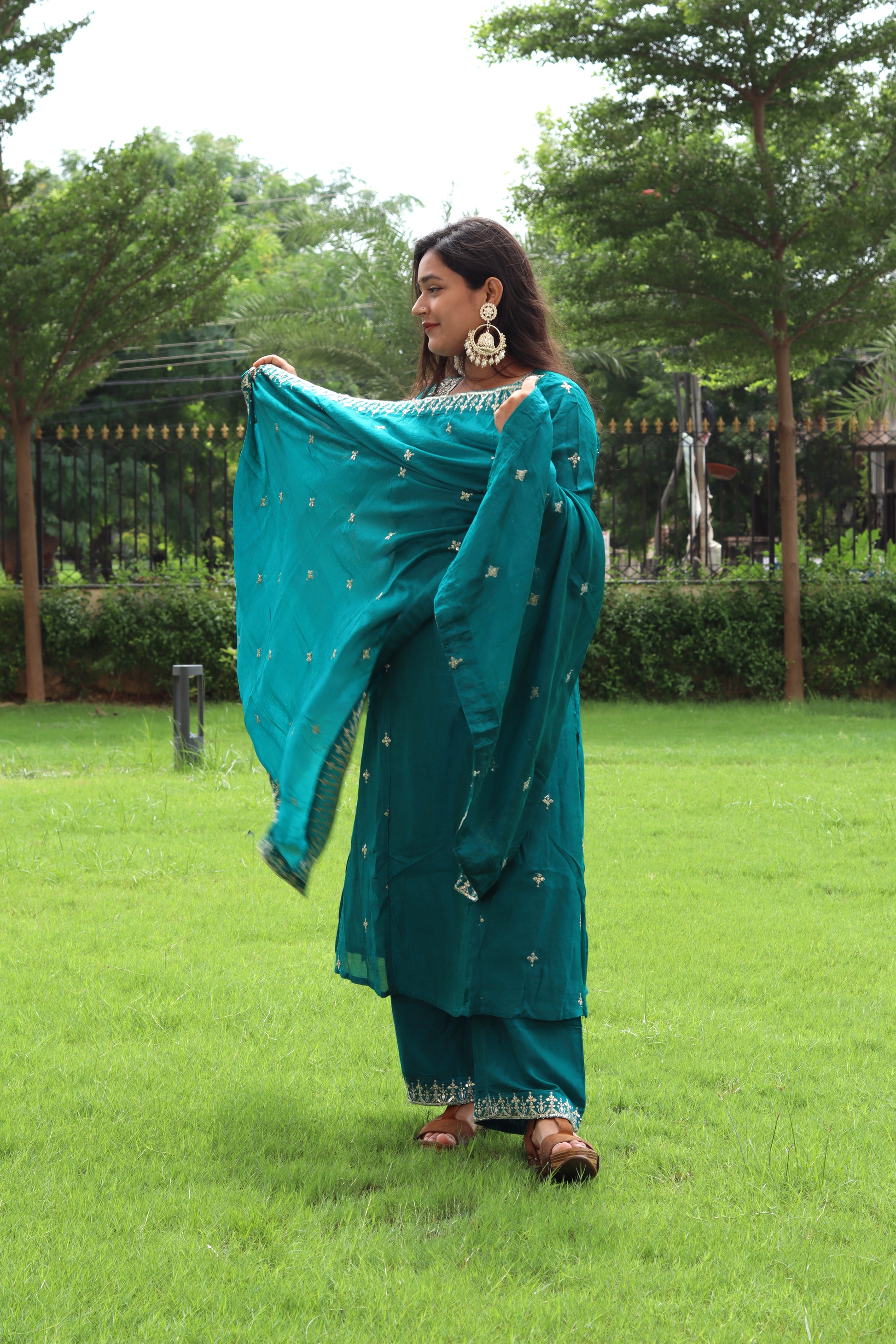 Teal Elegance Embroidered Suit Set – Kurta, Pant & Dupatta