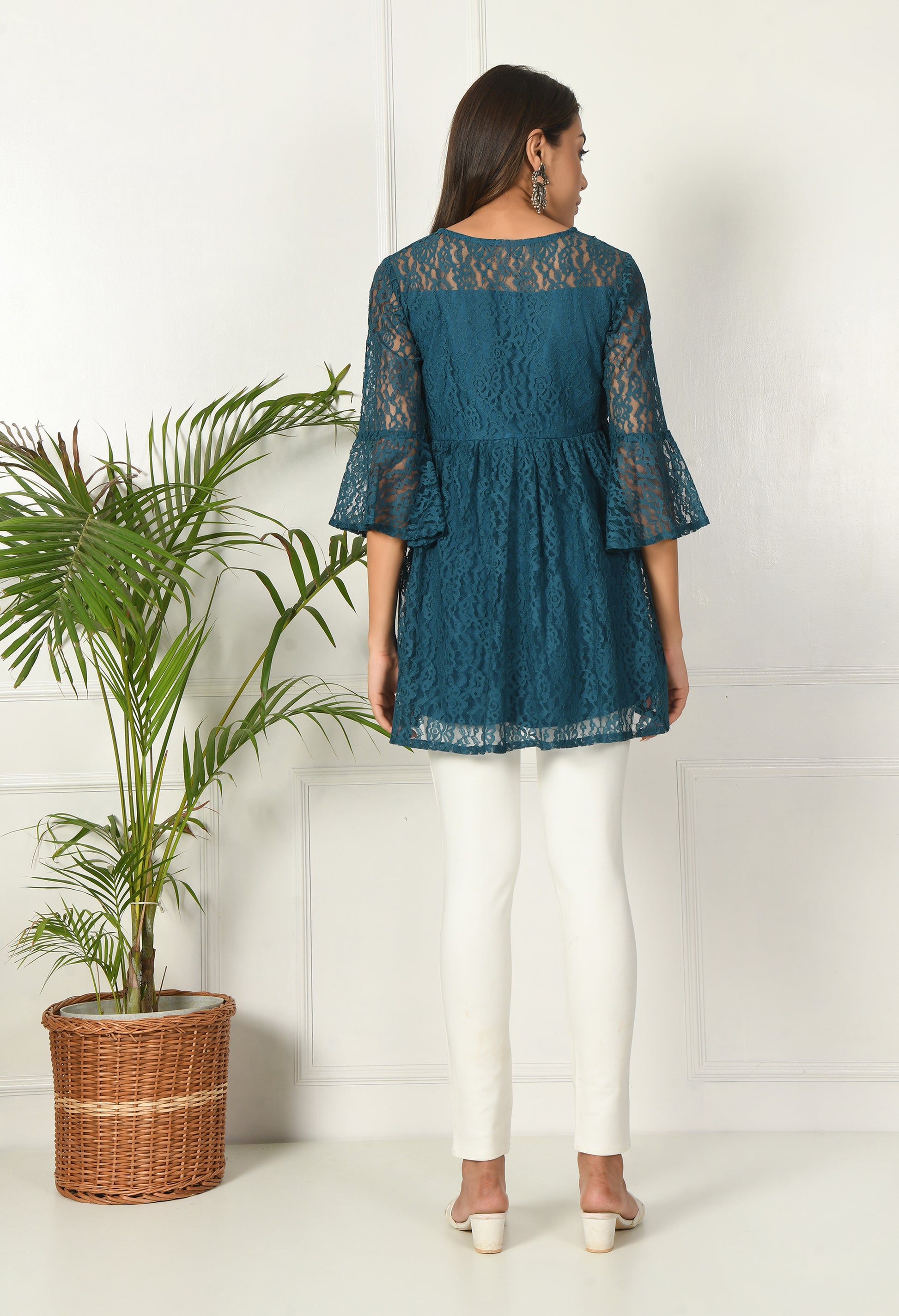 Add elegance to your everyday or festive look with this beautiful teal green lace tunic top. Designed in a flattering A-line silhouette with a round neck and flared three-quarter sleeves, this piece brings together grace and comfort. The intricate lace overlay and flowy fit make it a perfect pick for both ethnic and fusion styles.